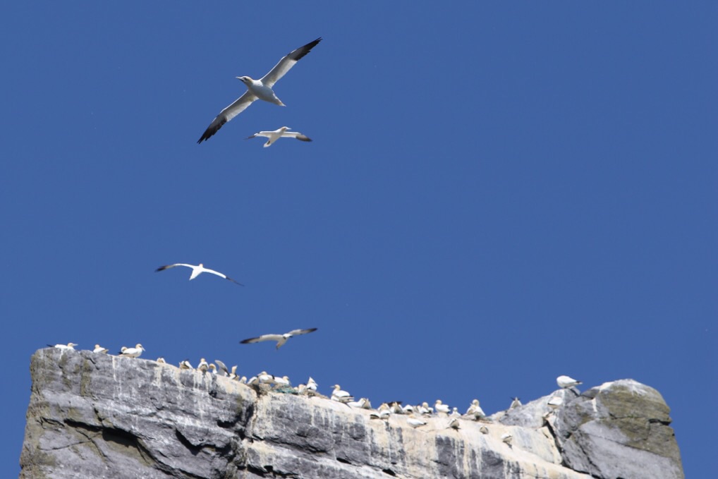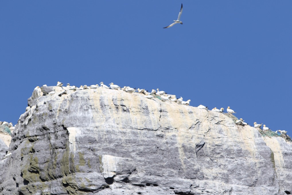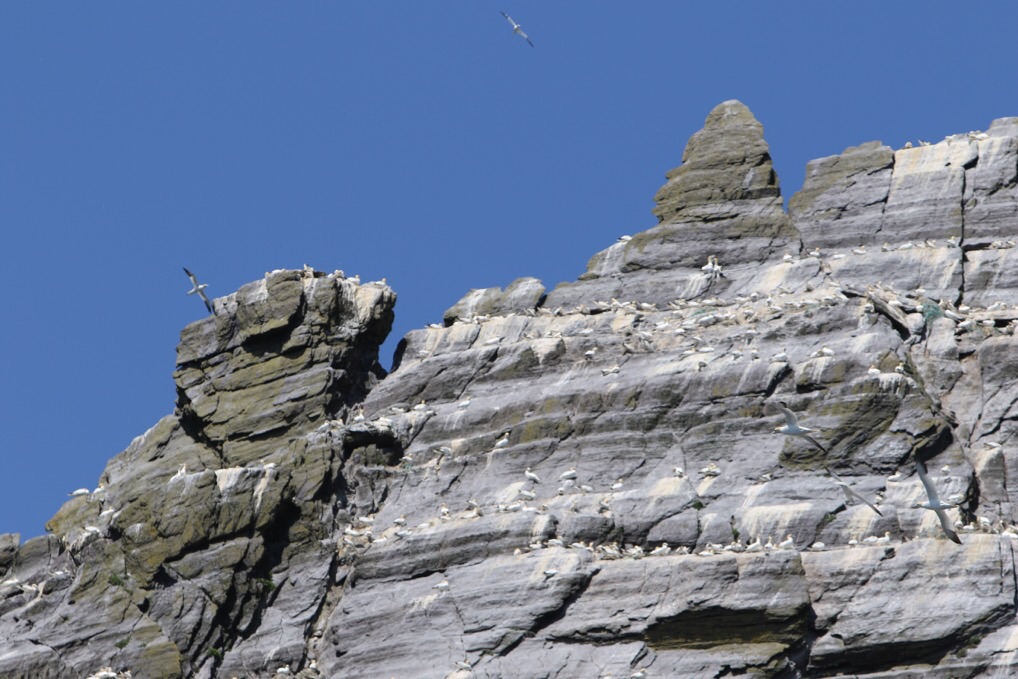 Nachdem man 2,5 Stunden auf Skellig Michael verbracht hat, bringt einen das Boot noch direkt vor die kleine Insel. Auf dem Weg dorthin schwamm direkt neben dem Boot eine Delfin-Mama mit ihrem Jungen. Die kleinere Insel ist vollständig belagert von Unmengen Basstölpeln, die um diese Zeit hier brüten und deren Kot der Insel einen weißen Anstrich verschafft. Auch ein paar Robben halten dort Siesta in der Sonne.