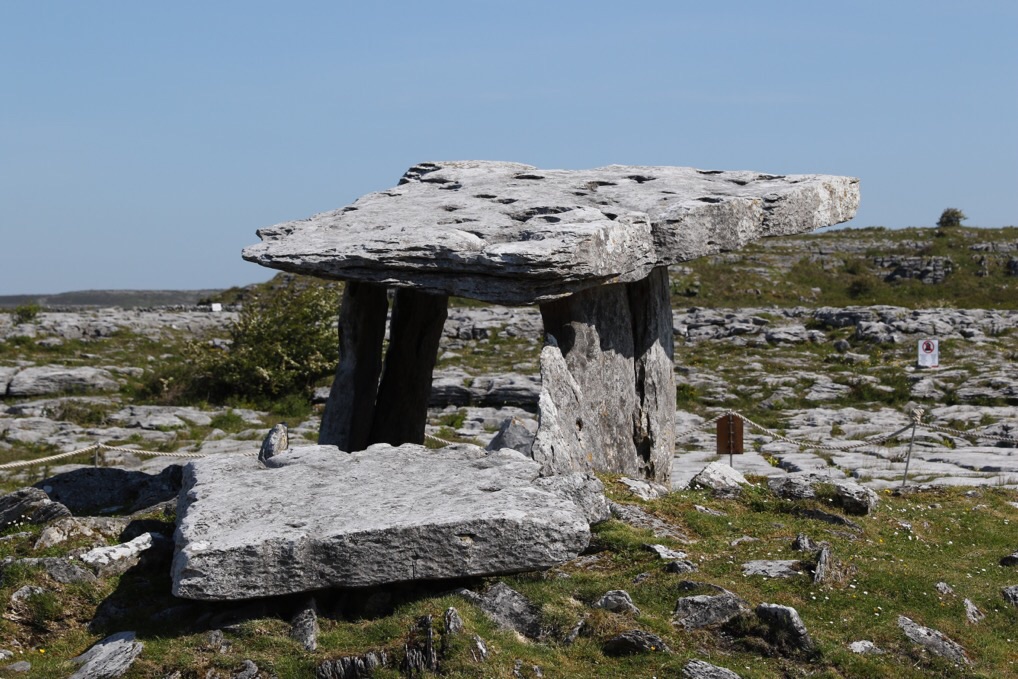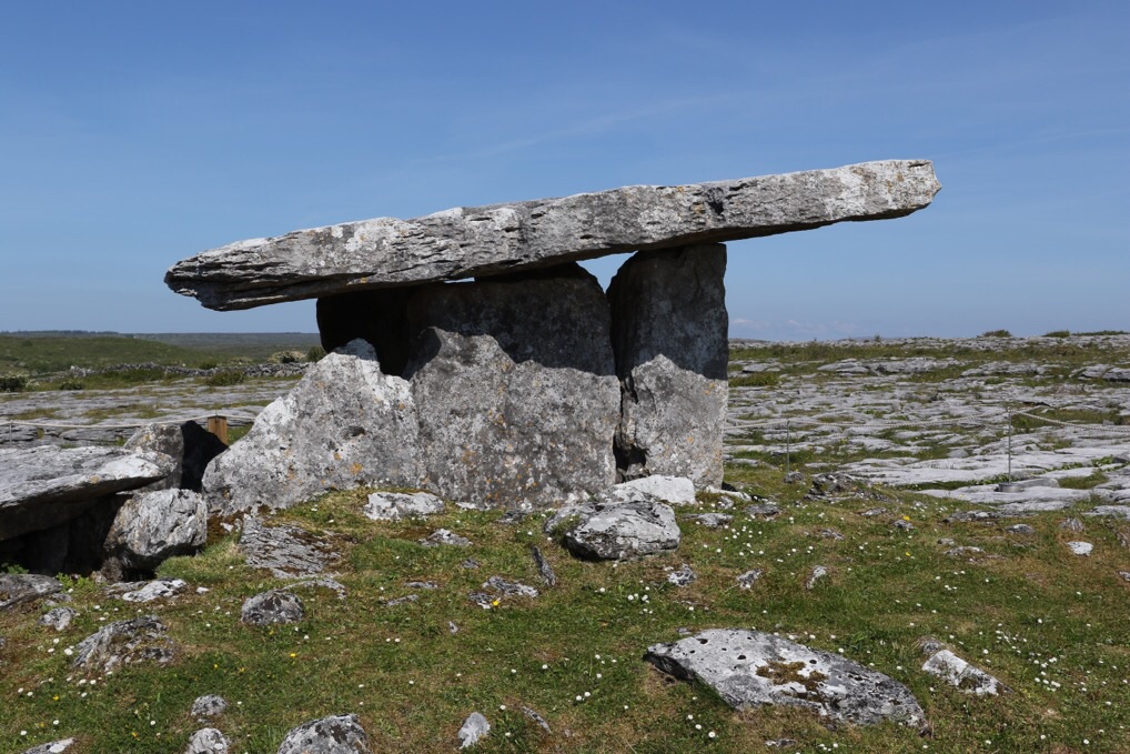 Inmitten dieser Landschaft findet man viele Portalgräber. Das bekannteste ist der Poulnabrone Dolmen, obwohl dies gar kein Portalgrab ist, sondern nur ein schlecht restauriertes Wedge Tomb. Nichtsdestotrotz werden die Leute dort busweise ausgekippt. Es stammt aus dem 3. Jahrtausend vor Christi und steht noch heute.