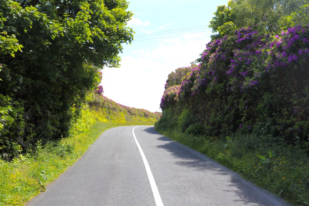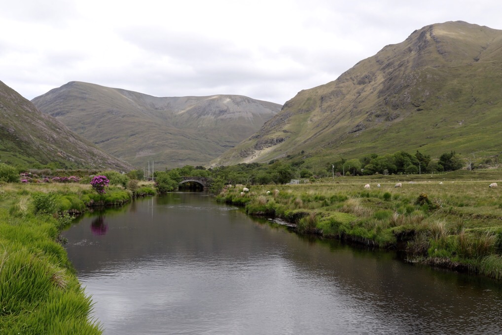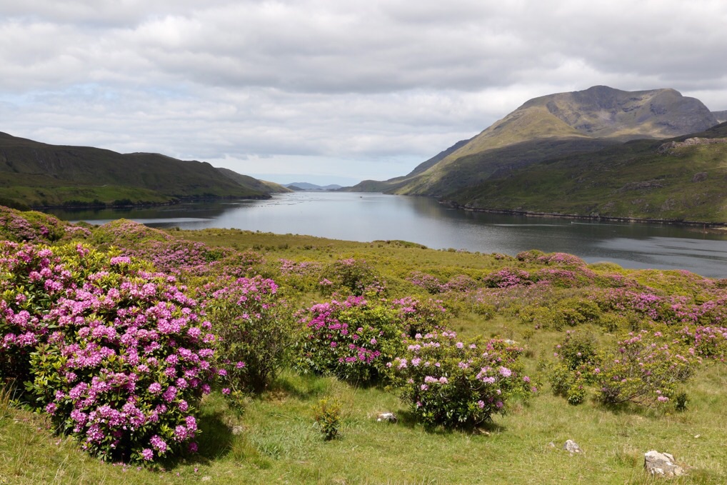 Mein erstes Ziel war Killary Harbour, Irlands einziger Fjord, der zwischen hohen Bergen ins Landesinnere drängt. Hier lohnt es sich, die kleinen Straßen rund um den Fjord zu erkunden, die tolle Aussichten auch auf die umliegenden Berge bieten. Und wieder fällt der Rhododendron auf, der überall mit seiner lila Blütenparcht die Landschaft verschönert. Gleich hinter dem Fjord begegnet man den Aasleagh Falls.